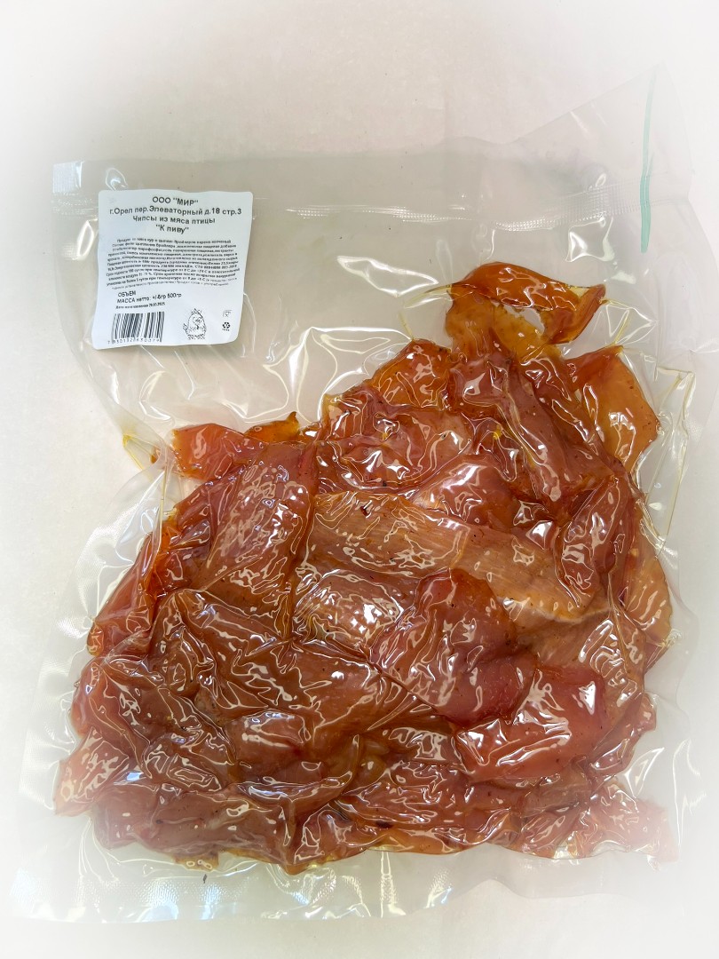 Мясо Чипсы куриные "К пиву Острые" (г.Орёл) 0,5 кг – вкусная закуска к пиву, которую в нашей компании вы сможете купить по привлекательной цене. Каждая партия проходит строгий контроль качества – сначала проверку осуществляет производитель, а затем мы. Поэтому вы получаете только свежий и отборный продукт.